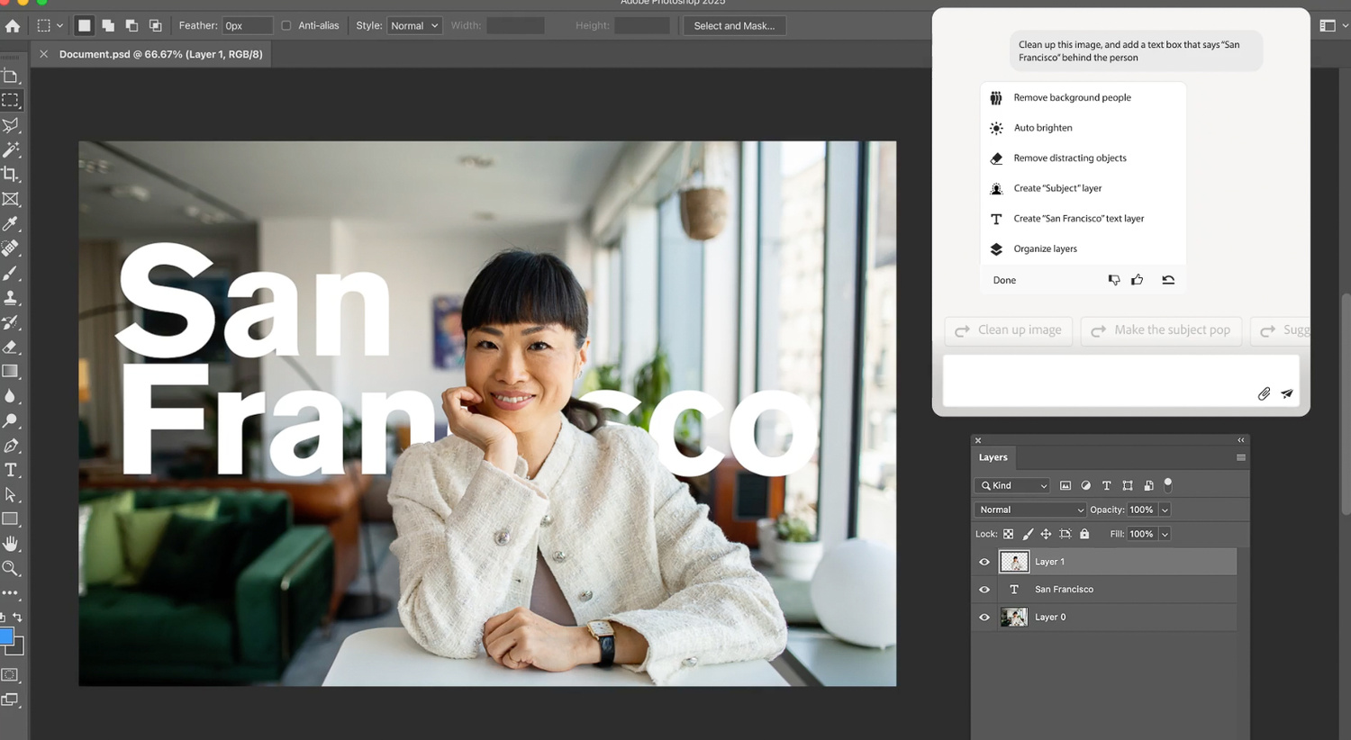 In one example provided by Adobe, a user opens a photograph of a person sitting at a desk and uses the simple command, “Clean up this image and add a text box that says, ‘San Francisco’ behind the person.” Instantly, the program makes adjustments to the look of the image and adds a new layer containing the desired text. Most Fstoppers readers are knowledgeable enough to handle these tasks without assistance, but using this technology can save time, allowing the user to focus on the creative aspects of image adjustment rather than the technical.