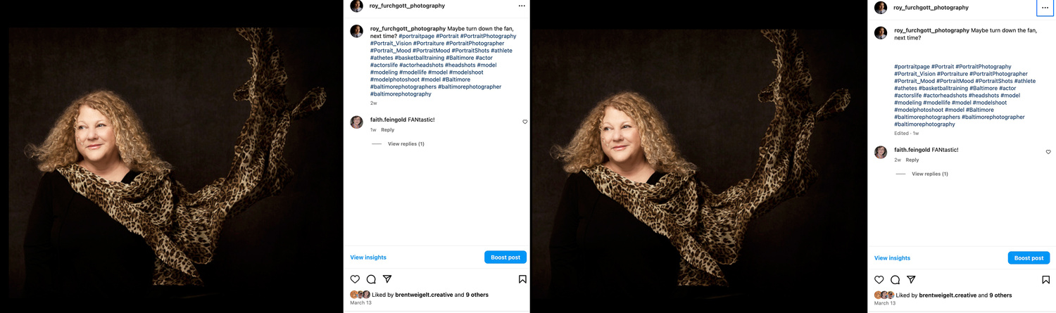It doesn’t have to be elaborate. For instance, a before and after. “Go back to when you first picked up a camera,” said McGavin, “and if it’s not very good, it’s funny.” Especially if you juxtapose it with a masterful, more recent image to show your progress. So run the first shot with text reading “before,” then the second image with “after.” It can work as an Instagram Carousel, a Story, or a Reel.