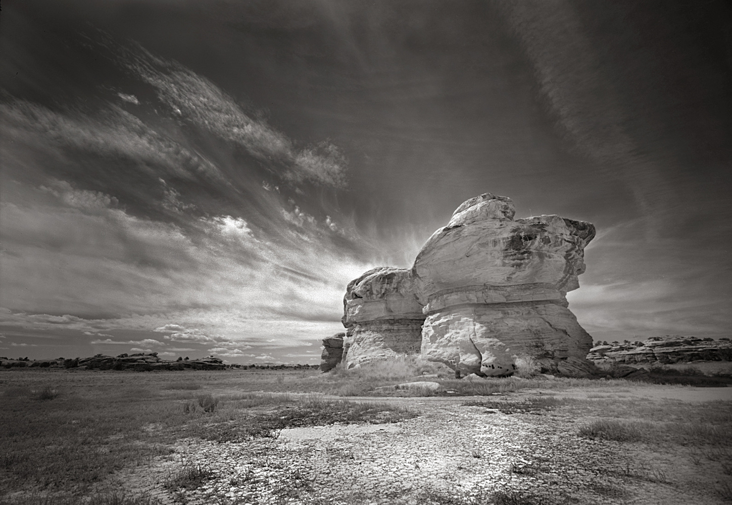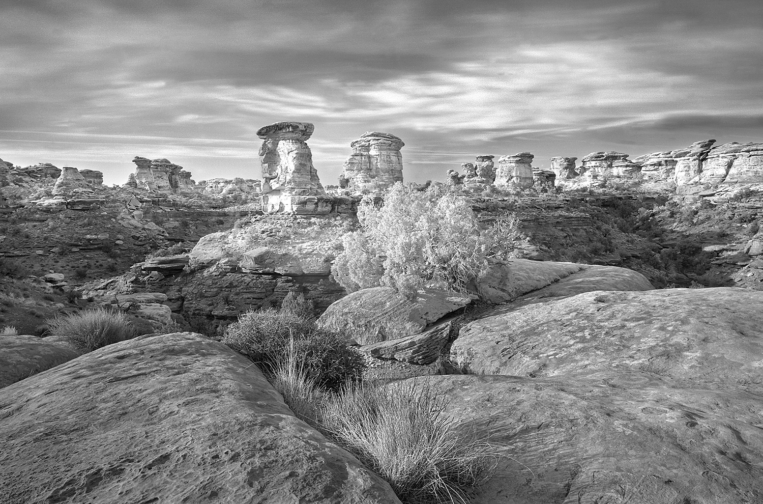 This image, Hot Mushroom Rocks Under a Big Sky, was created one late April afternoon. A buddy of mine and I had gone to Canyonlands for a week of photography and camping. I had endured heart surgery late in the summer before, and against the advice of my doctor and the better judgment of my wife, I scheduled a long backpacking expedition with a buddy from Santa Fe. This image connects the foreground salt pattern with the midground and leads to the object of main concern—the mushroom-shaped rocks—with the sky as a supporting element. It was done around late morning, and maybe the memorable thing for me was that it was so hot with billions of tiny, bitey bugs.