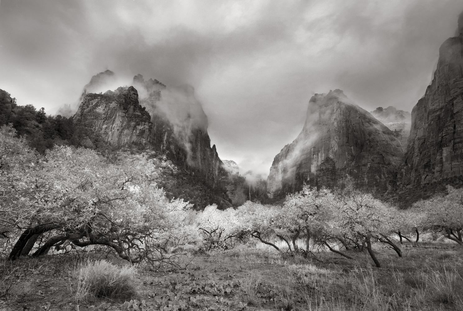 When I made this image, I was leading a workshop program that I used to teach out of Page, Arizona. It had rained almost continuously from the first day of the workshop, and I decided we would pull up stakes and go to Zion National Park, which is about 100 miles to the west. I called a motel I was familiar with in Springdale, Utah, and they had enough rooms available. The first day we were there, the storm began breaking up about mid-morning, so we moved up-canyon to a location I was familiar with that wasn’t too far off the road. The foreground was covered with prickly pear cactus, with the Gambel’s oak trees in the midground appearing to bow inward in front of the Court of the Patriarchs, with a very dramatic clearing storm over them.