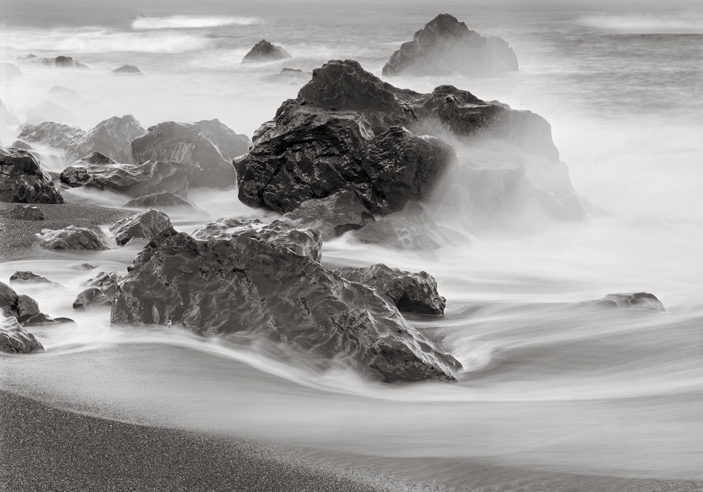 I don't live near the ocean, so being able to be there is an absolute treat. I was really wanting a lot of movement in the foreground of my image. However, for a novice ocean watcher like me, it is extremely unpredictable, and to a degree, each photograph here is a crapshoot. Maybe it'll work, maybe not. However, in this case, the movement of the water painted in almost exactly what I wanted. I think I did six sheets of film here, which is one full film holder; I use Grafmatic film holders, by the way. Out of those six, one was very good—this one—one is a maybe, and the other four didn't work at all for me.