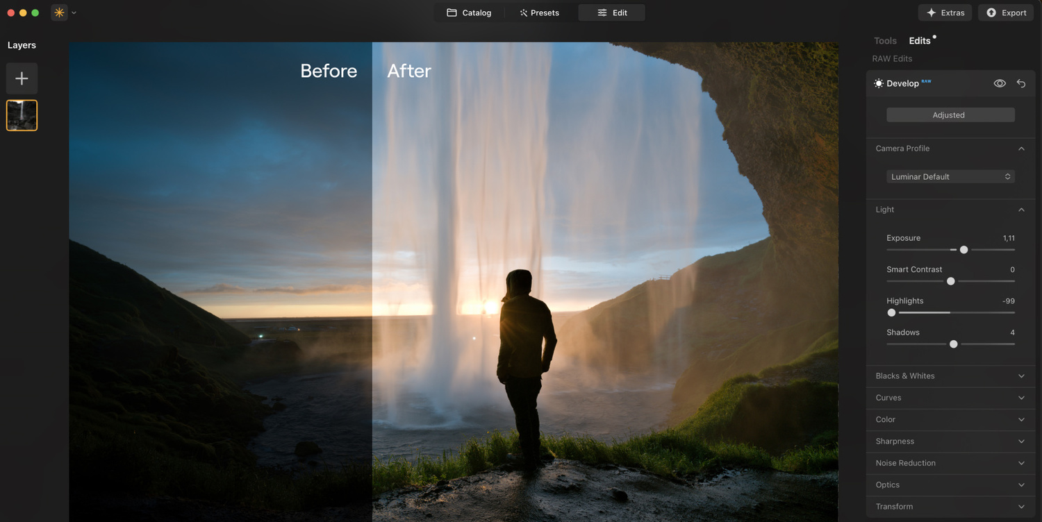 A new addition to the Develop / Develop RAW tool, Auto Adjust automatically enhances images by intelligently adjusting key sliders to achieve optimal exposure, light and shadow balance, and black and white levels. Available for Pro subscribers and Upgrade Pass owners.