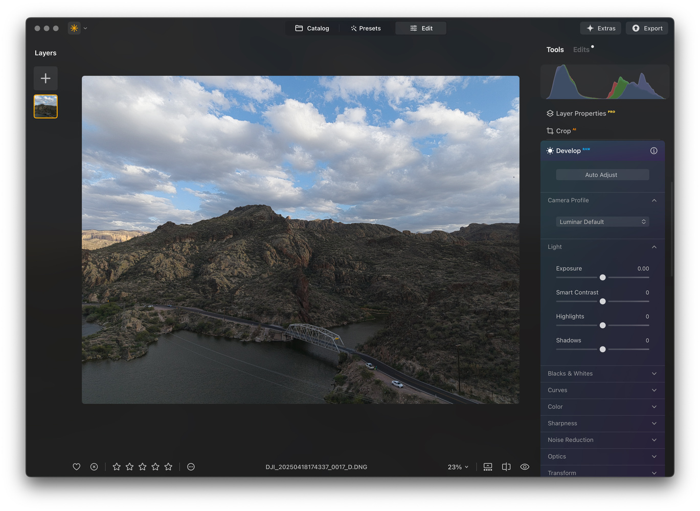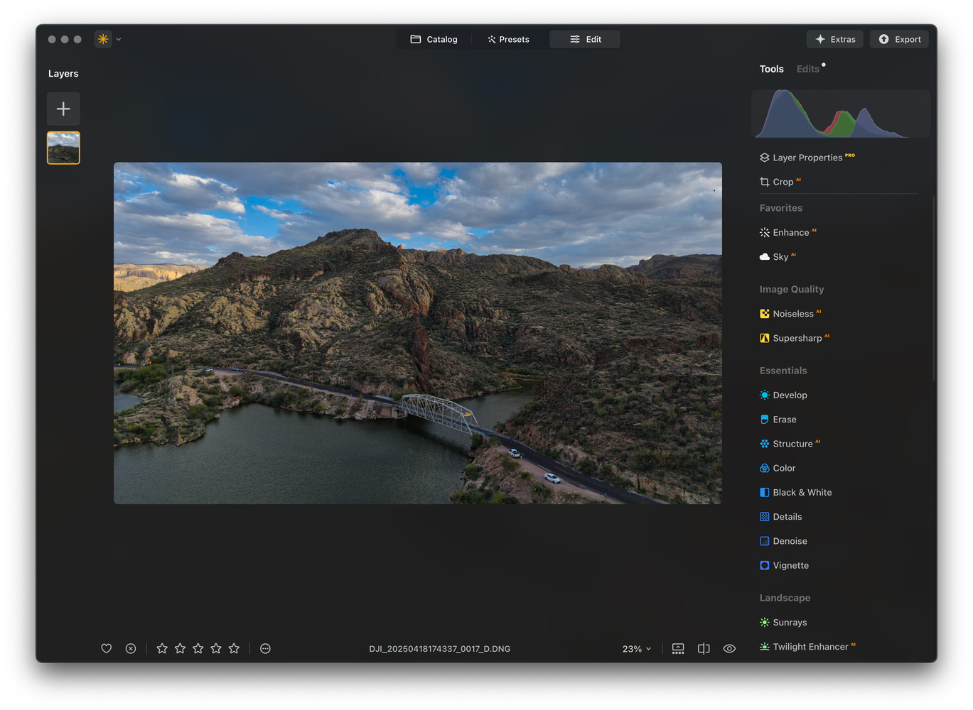 For pre-editing, I ran my raw file through DxO PureRAW 5, since they have just added Air 3S support for lens correction and sharpening.