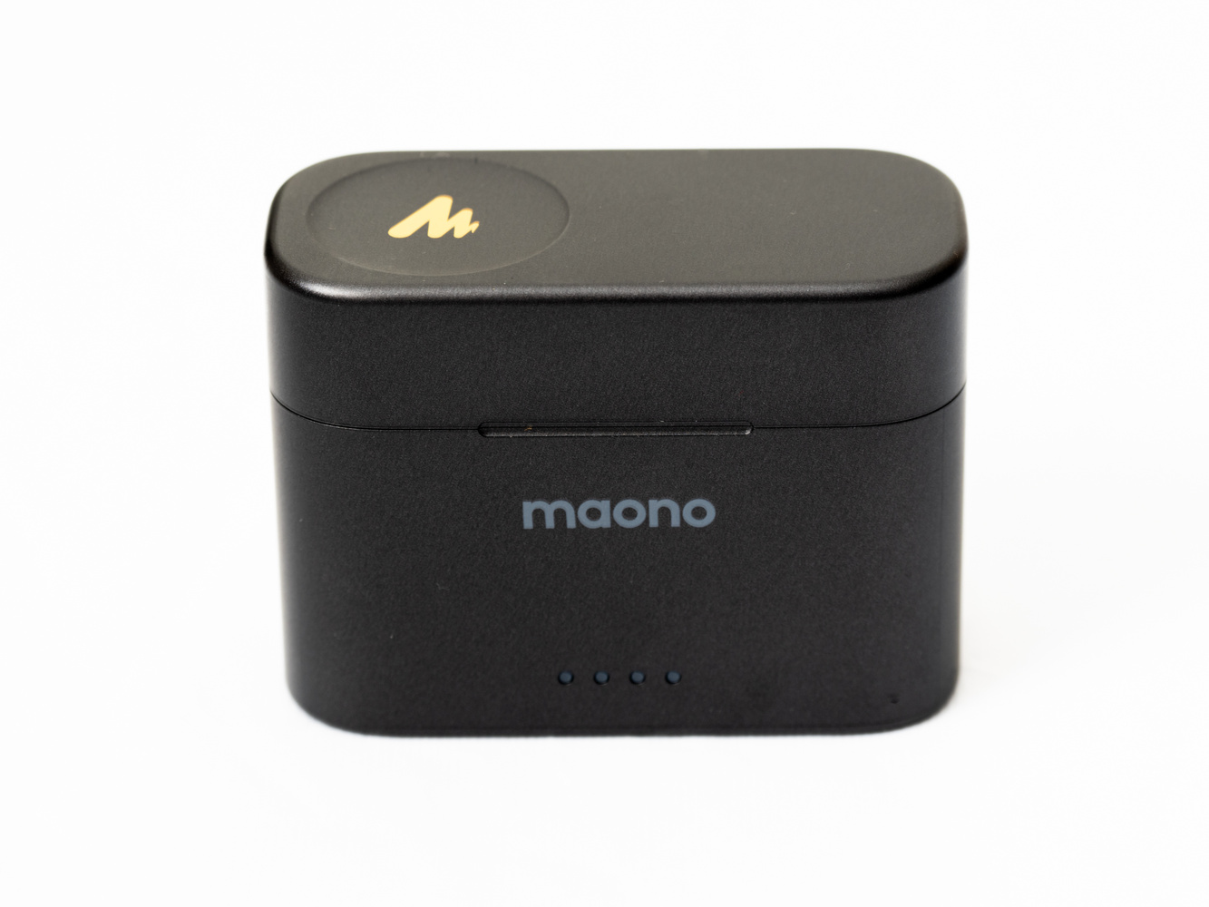 The charging case feels solid. It has a strongly sprung hinged lid, and on the front, four white LEDs show the charging status.