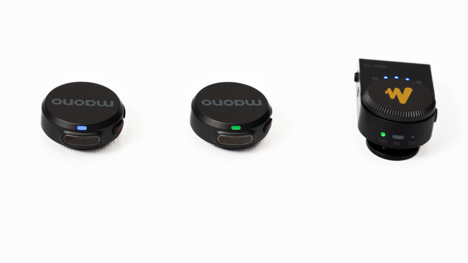 The transmitters each have a built-in microphone, a power/noise reduction button, a mute/remote camera button, an indicator LED, and a magnetic sheet for attaching the lapel clips or necklace. The magnets are strong enough to hold the mic in place through a thick coat if you don’t have a lapel to clip it to.