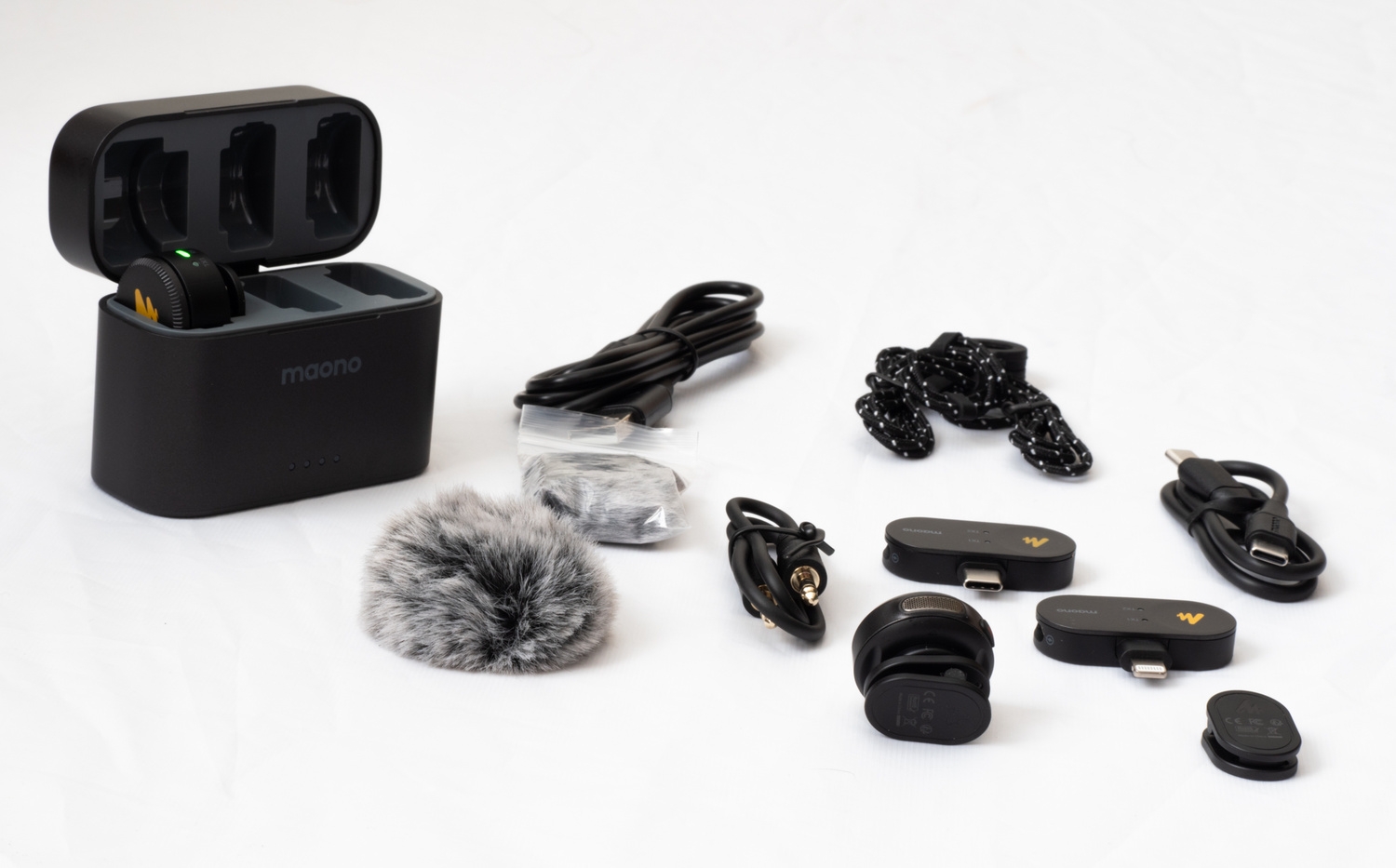 The kit I received was the Combo version, and the box comprised 2 x microphone transmitters, 1 x powered receiver, 1 x USB-C receiver for Android devices, 1 x Lightning receiver for iPhone devices, 2 x magnetic lapel clips, 2 x magnetic necklaces for the mics, 2 x “dead cats” (fluffy microphone windshields), 1 coiled 3.5 mm double-ended stereo audio cable, 1 x USB-A to USB-C charging cable, 1 x charging box, 1 x soft storage bag, 1 x hard storage case, and the user manual. There was also a sheet of 18 colorful stickers.