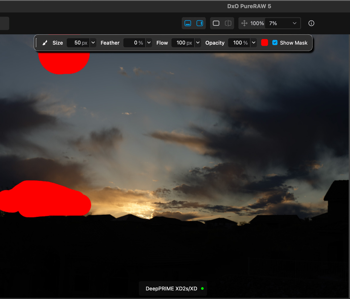 I tried it out, and it worked pretty well, but I thought it created needless work when it shouldn't need to. The bracket keys don't work to adjust the size of the brush, which is standard in most photo editors; you have to type the size into the interface, which is a needless task easily fixed with key commands. I'd love to see some AI put to work in this feature, like letting it select the sky or other objects, saving photographers the tedious painting. This feature feels a bit unfinished but could be very powerful if DxO rethought it a bit.