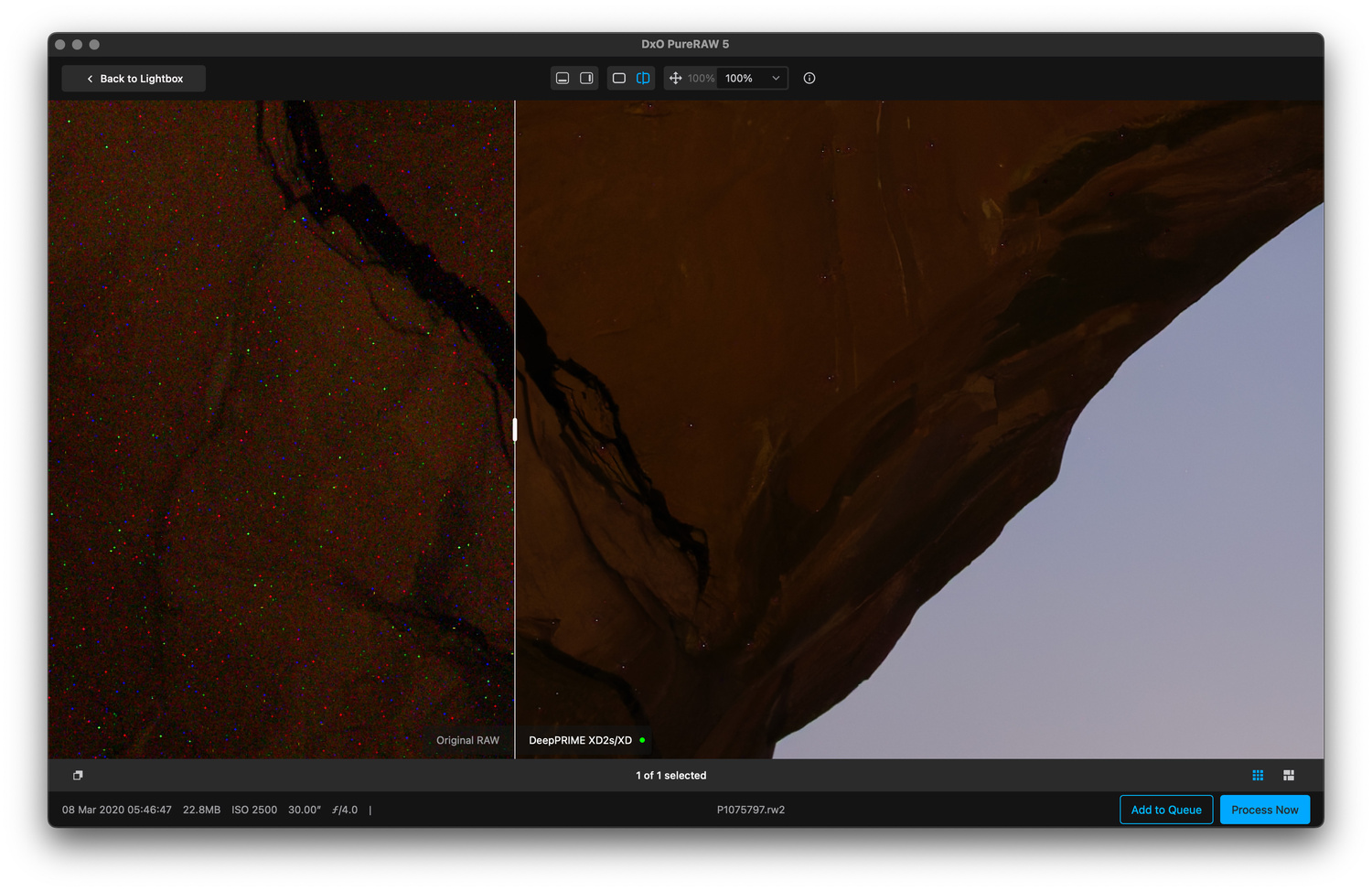 You could really see PureRAW earning its keep on this very low light image shot in Utah with a Lumix camera. There's a lot of color noise which is easy to see, yet PureRAW eliminated the noise, saving this image.